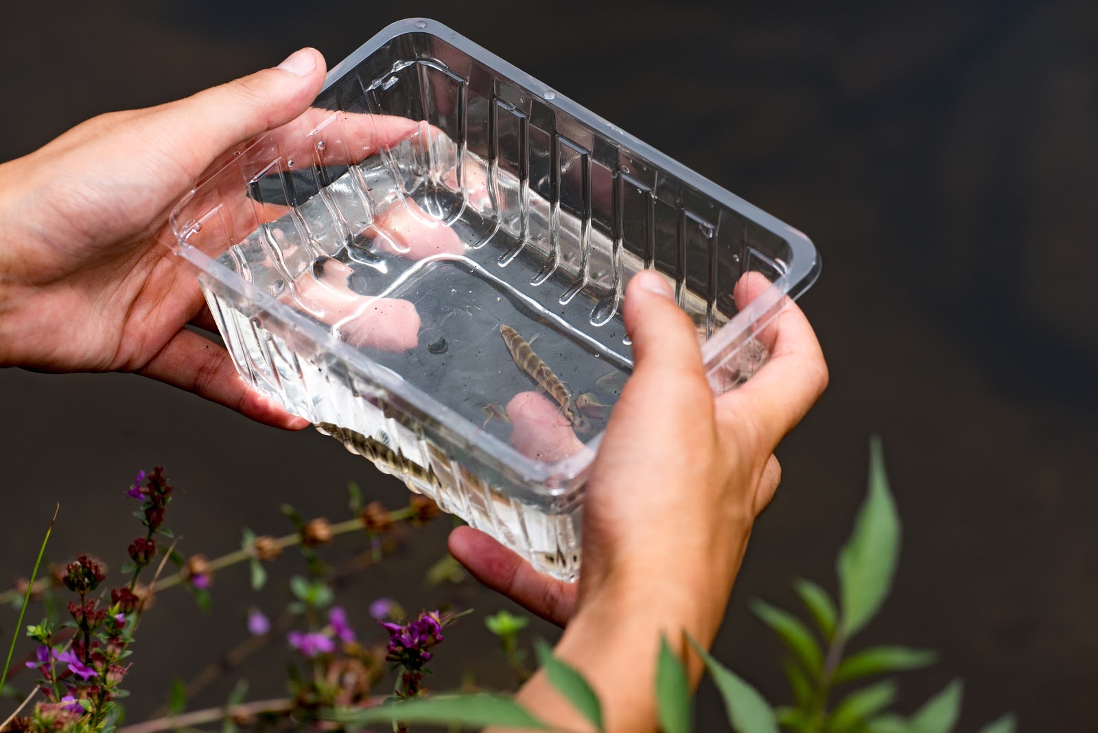 小学生(千種小学校)が育てたアユモドキを放流しました。
